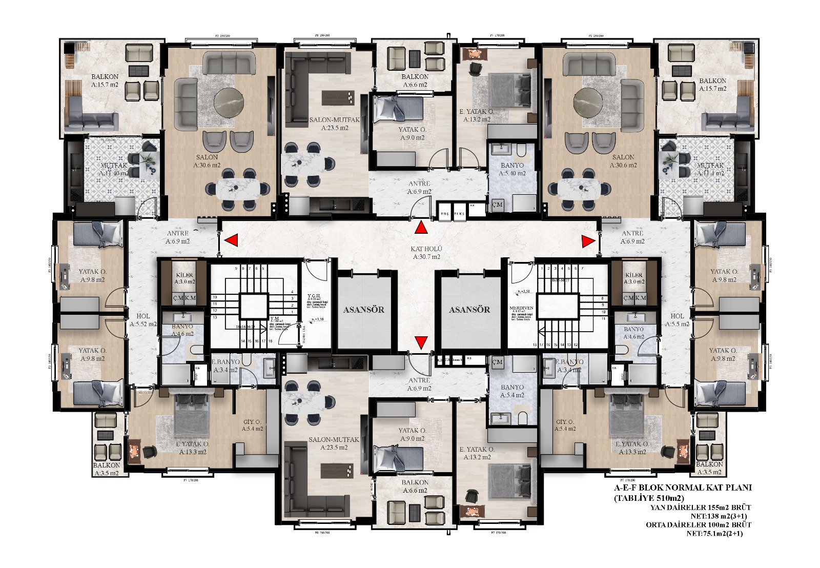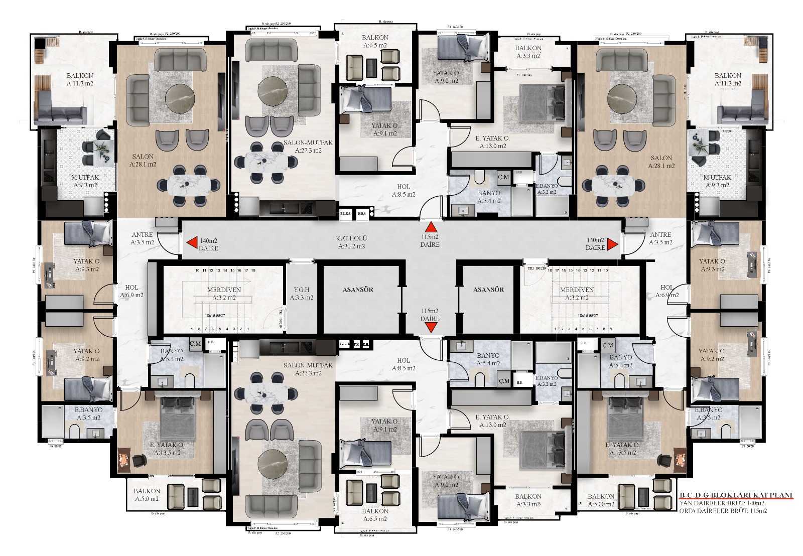 • Ortak alanları ve hidrofor sistemini destekleyen jeneratör.